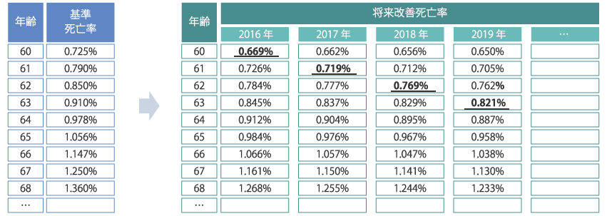 右側が将来改善死亡率で、縦軸が年齢、横軸が暦年のマトリクスになっています。実際に死亡率を適用するときは、左上から右下へ斜めに読んで死亡率を適用していきます。現在時点の年齢が異なれば、適用される死亡率も異なることになります。暦年が進むごとに死亡率が改善される前提では、現在年齢が低い者ほど、同じ年齢で将来適用される死亡率は低くなります。