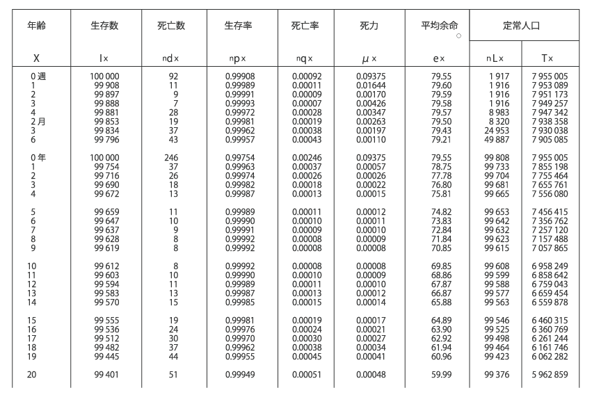 この表は上から下に時間が流れていくかのように読めます。ある時点でちょうど0歳の人が100,000人いたとします。そこから半年後にそのうち246人が死亡します。その半年後、つまりスタートから1年が経過した時点ではちょうど1歳の人が99,754人生存していることになります。これを生存者が0になるまで続けていきます。