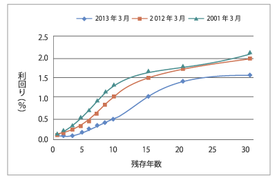 | 2012年度の最終局面で、日銀の国債買い入れ量増加見通しから債券相場で利回りが低下した(図1、図2参照)ことを割り引く必要はあるけど、年限別の債券インデックスのリターン実績を振返ることにより、投資のヒントとして得るものもある。 |